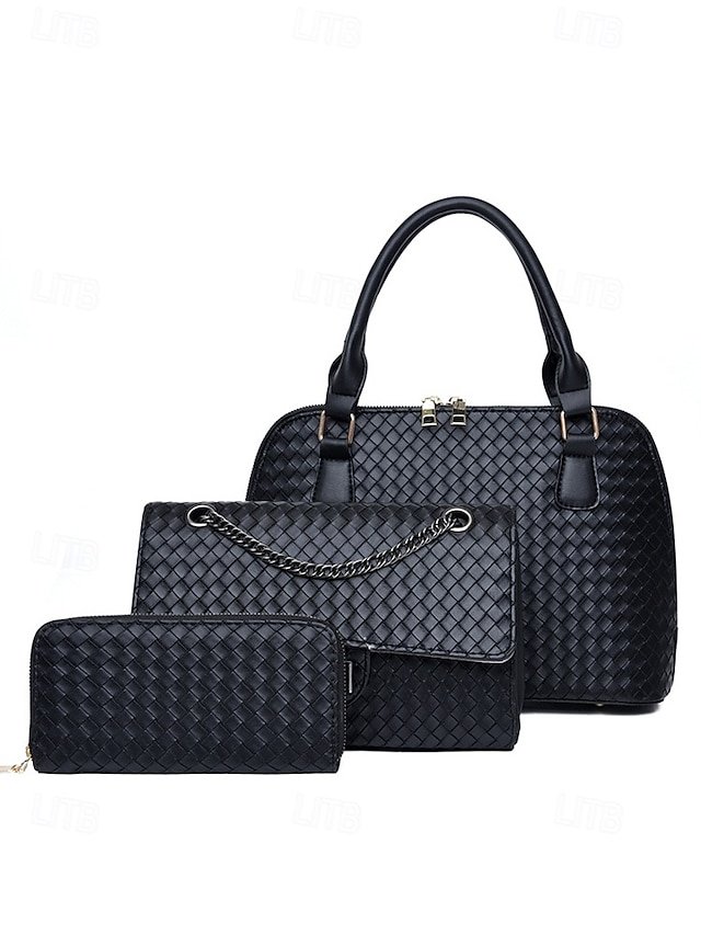 Women’s 3-Piece Brown Woven Faux Leather Handbag Set –
